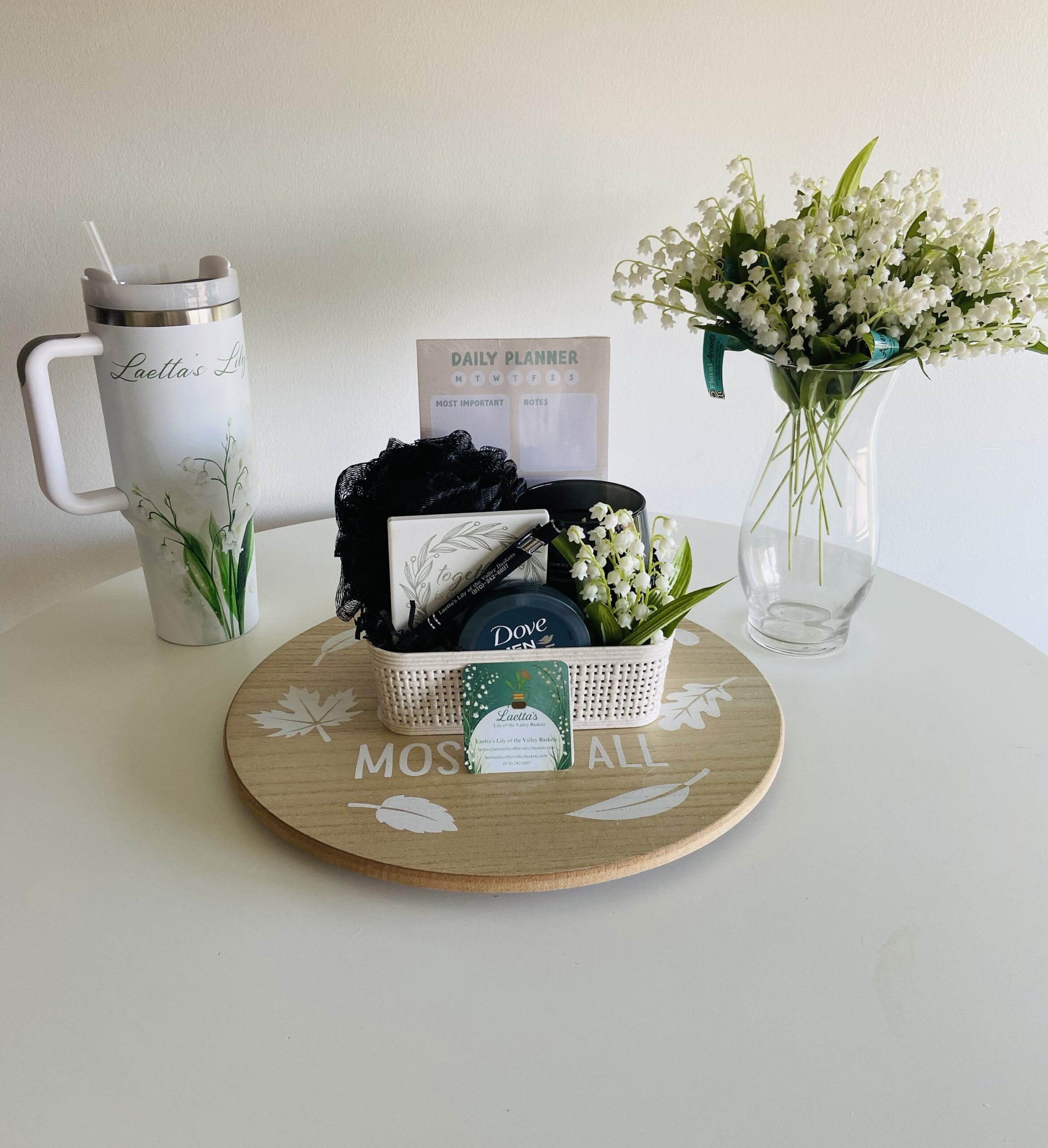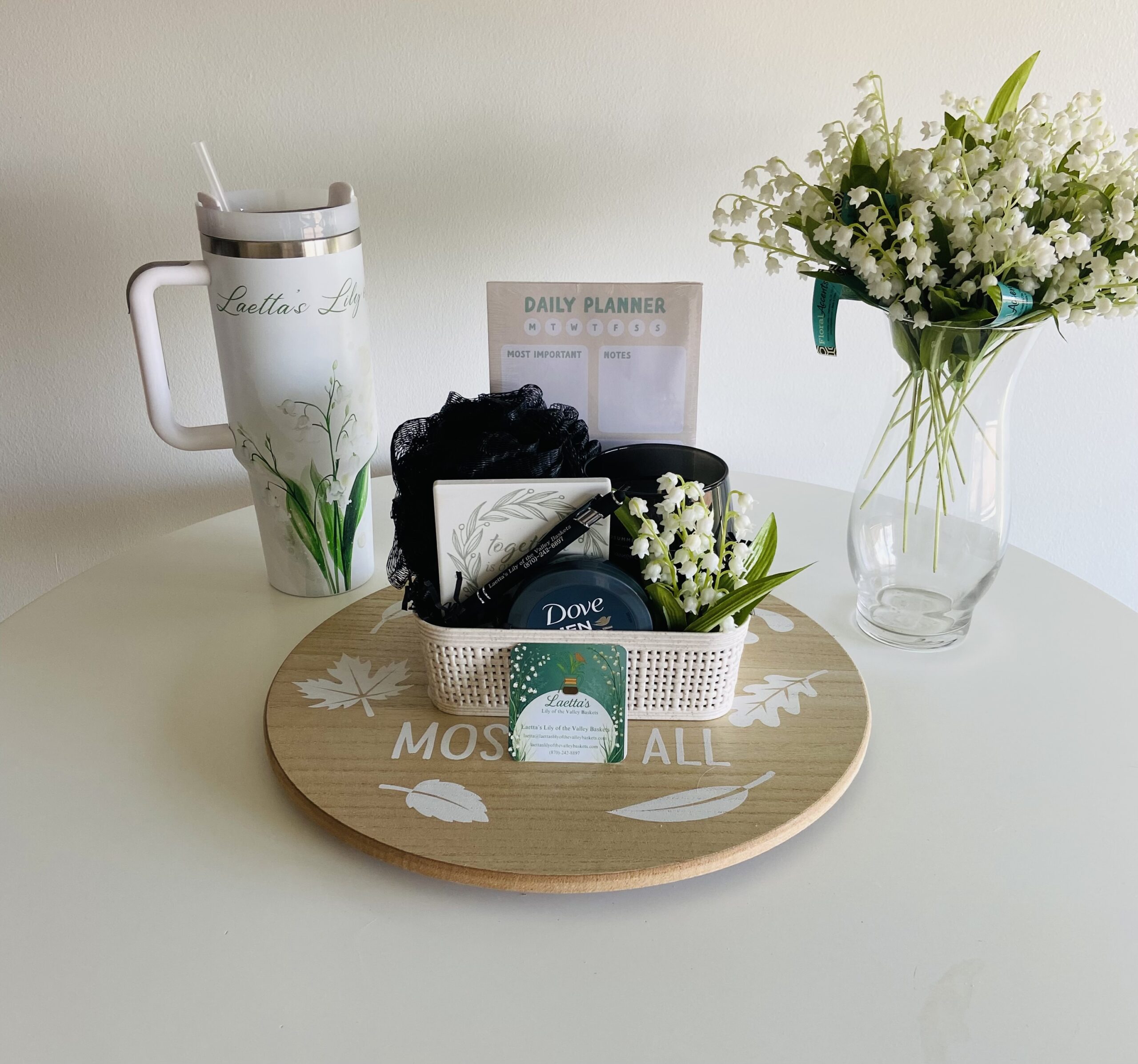 All black products Loofah sponge, black candle, and pen. Non-black is notepad, lotion, and coaster.