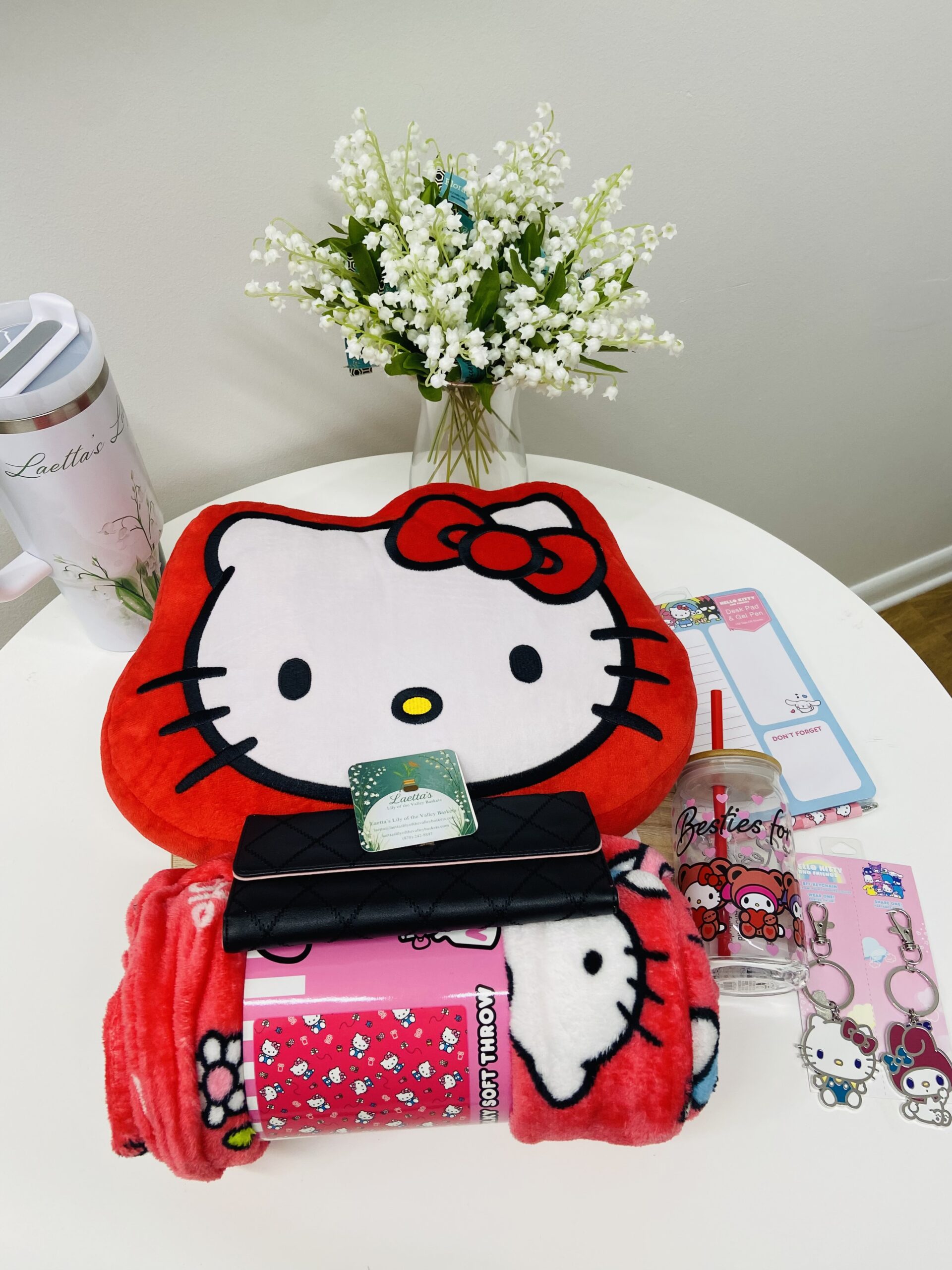 Plush hello kit pillow and throw, included with a hello kit glass tumbler,notepad and pen, keychain, and a wallet.